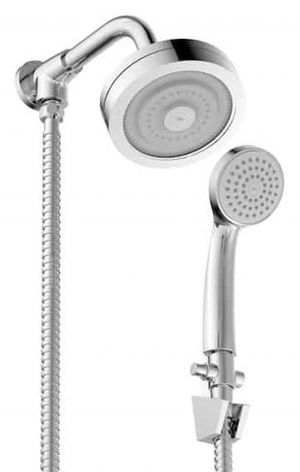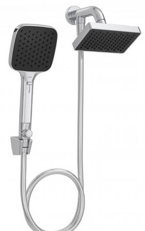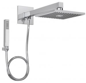Com design geométrico marcante e acabamento cromado, este modelo combina chuveiro fixo com ducha manual integrada, ideal para banheiros modernos que priorizam funcionalidade sem abrir mão da estética.