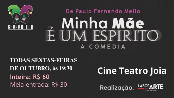O Cine Teatro Joia recebe em outubro a comédia “Minha Mãe é um Espírito”, novo trabalho dos atores Ana Carolina Rainha e Lucas Figueiredo, dupla que já atua junta há quase uma década no sucesso “Allan Kardec – Um Olhar para a Eternidade”. O espetáculo, com direção geral de Ticiana Studart, será apresentado nos dias 3, 10, 17, 24 e 31 de outubro, sempre às sextas-feiras.