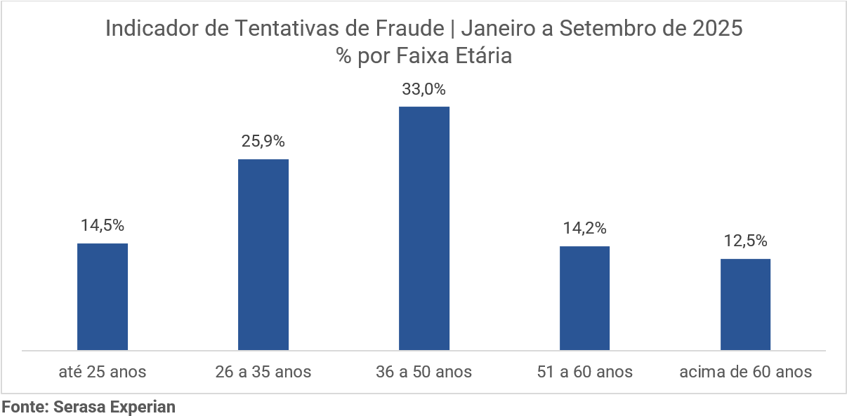 Golpistas visam pessoas economicamente ativas As vítimas de 26 a 50 anos concentram, em conjunto, 58,9% de todas as tentativas de fraude mapeadas no período, evidenciando que o foco dos criminosos recai justamente sobre o público em plena atividade econômica e com maior intensidade de uso dos canais digitais. Especificamente, consumidores entre 36 e 50 anos respondem por 33% das ocorrências, enquanto o grupo de 26 a 35 anos concentra 25,9%. Confira abaixo um gráfico com detalhamento da distribuição das fraudes por idade: | ||