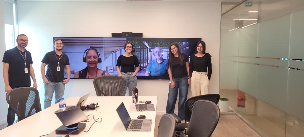 Da esquerda para a direita: Marcos Menegazzi, Guilherme Sibinel, Thays Oliveira, Tais Larocca e Maria Eduarda Schmidt. Na tela, Fabiana Silva e José Garcia Coelho | |